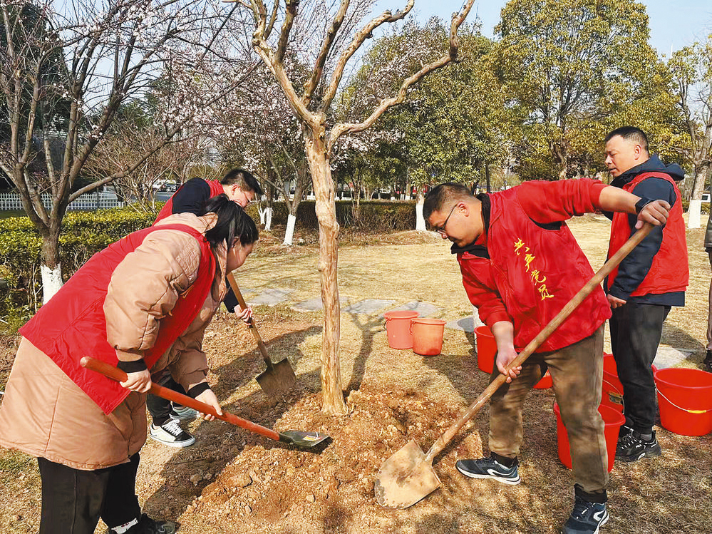 为进一步提升市场周边绿化环境,在第45个植树节来临之际,商城集团国际商贸城第五分公司党支部与旅游公司党支部的党员们在市场周边开展植树活动。(吴峰宇)