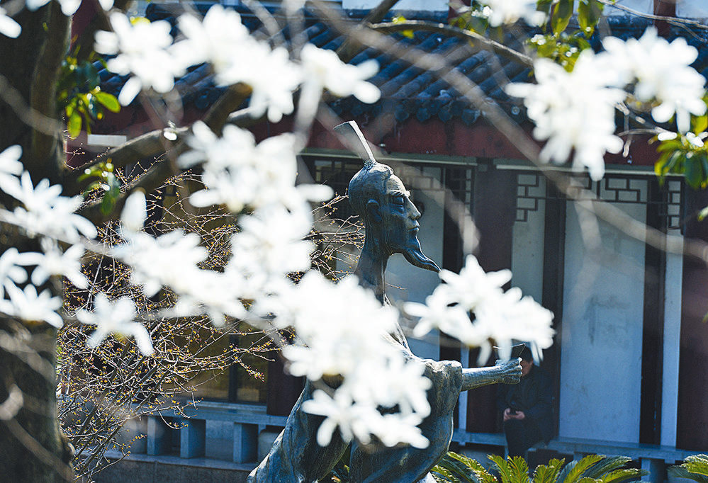 江滨绿廊里雕塑与洁白玉兰,相映成趣。
