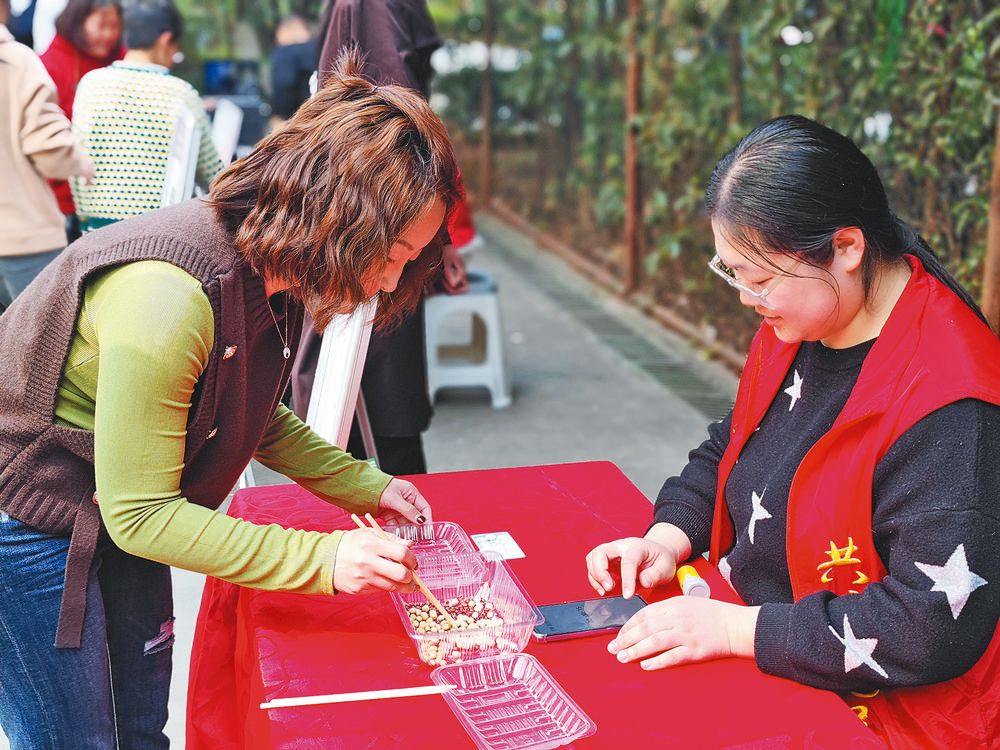 此次活动内容形式多样:有踢毽子、套圈、夹豆豆等,特别在挑战“夹豆豆”的活动过程中,技艺高超的居民引得围观群众纷纷鼓掌加油,现场气氛十分活跃。活动现场充满了欢声笑语,居民们兴致勃勃地参与各个趣味游戏,大家各施其技,力争取胜,在游戏中尽情地享受着节日带来的喜悦与欢乐,爽朗的笑声把游园活动一次次推向高潮。(龚盈盈)